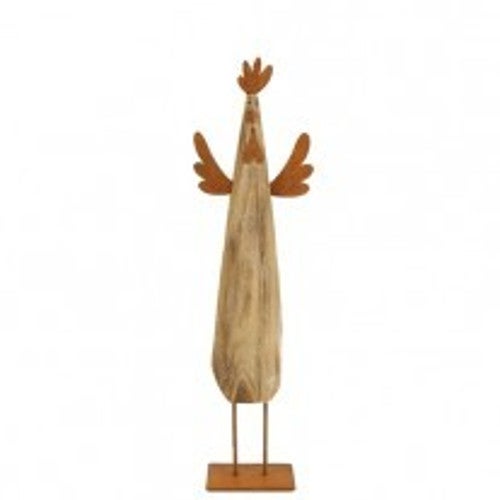Kip op voet. Gemaakt van hout en roestig metaal.