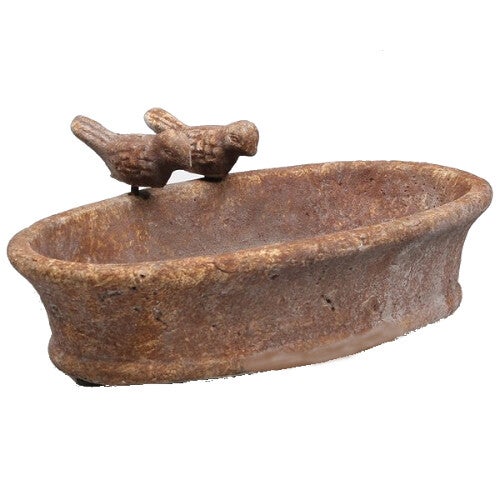 Deze bad-/drinkschaal in tijdloze uitvoering voegt niet alleen veel sfeer toe, maar biedt de vogels een veilige en verhoogde drinkplaats aan. Op de rand hebben zich al twee vogels gesetteld, het is aan andere vogels om dit vorbeeld zo snel mogelijk te volgen.