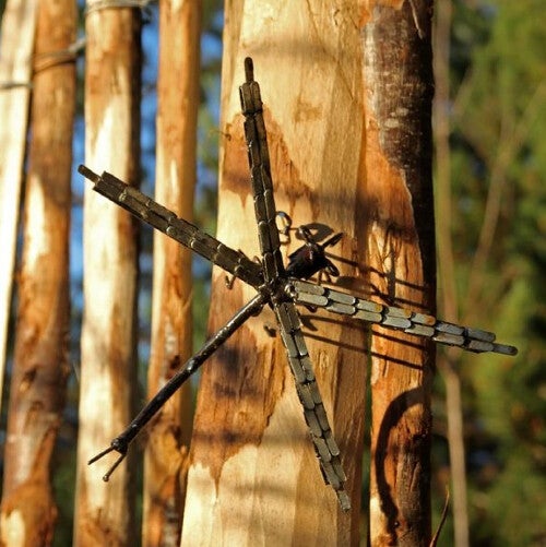 Deze libelle is altijd op zoek naar mooie bloemen en vangt graag wind. De vleugels zijn glanzend afgewerkt. De libelle is makkelijk te bevestigen aan een muur of schutting door de metalen ring aan het pootje.