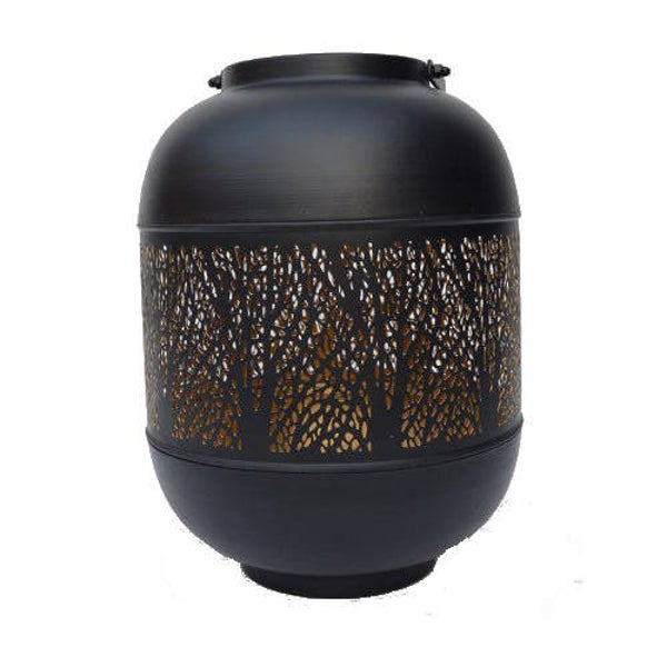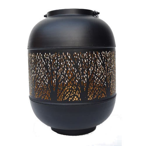 Deze mooie zwarte lantaarn heeft in de rondte een boommotief. De binnenzijde van de lantaarn is goud van kleur. Het opengewerkte metaal geeft een prachtig sfeerlicht wanneer de kandelaar van binnenuit wordt verlicht door een kaars of lichtsnoer. Om een mooi, sfeervol tafereel te creëren is het mooi om meerdere lantaarns met hetzelfde motief te plaatsen.
