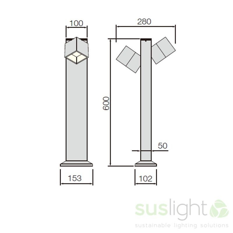 De Sus Cube Duo 230V heeft 36 LED lampjes, een lichtbereik van 2 keer 150 cm en een straalhoek van 40°. Het armatuur is 60 cm hoog en het breedste punt is 28 cm. De voetplaat is 15.3 cm breed en 10.2 cm diep.